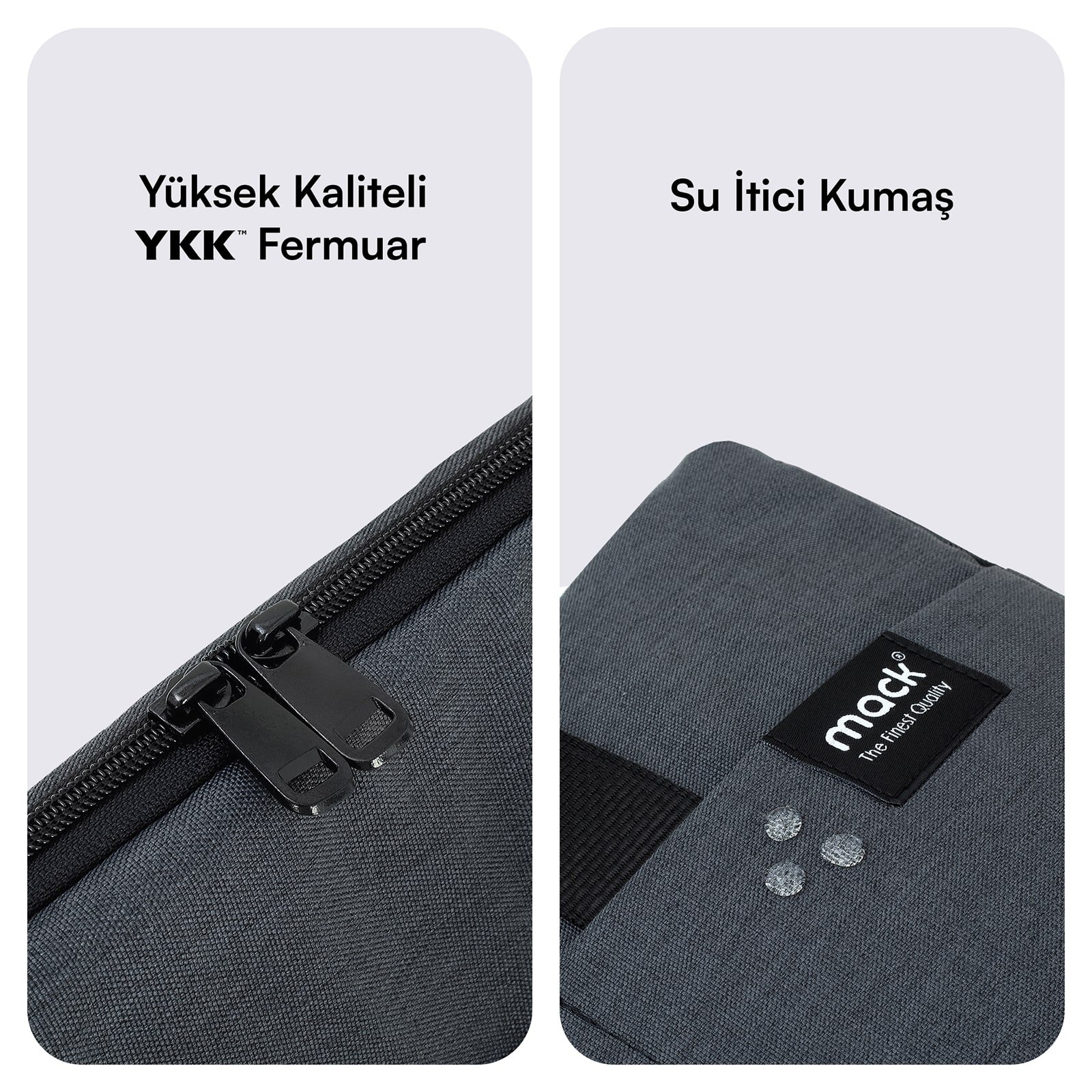 Çevreci ve Kaliteli Malzeme: Laptop çantası çevre dostu geri dönüştürülmüş su geçirmez kumaştan üretilmiş ve yüksek kaliteli YKK fermuar ile donatılmıştır. Bilgisayar çantasının tüm bileşenleri Avrupa Birliği normlarına göre Türkiye’de üretilmiştir ve hiçbir zararlı madde içermez. Mack Laptop çantaları ile bilgisayarınızı korurken aynı zamanda çevreyi de koruyun.
